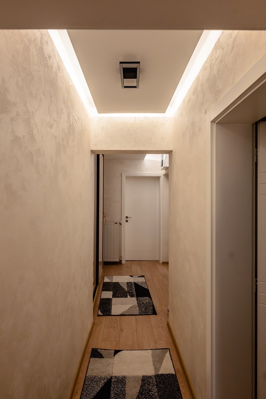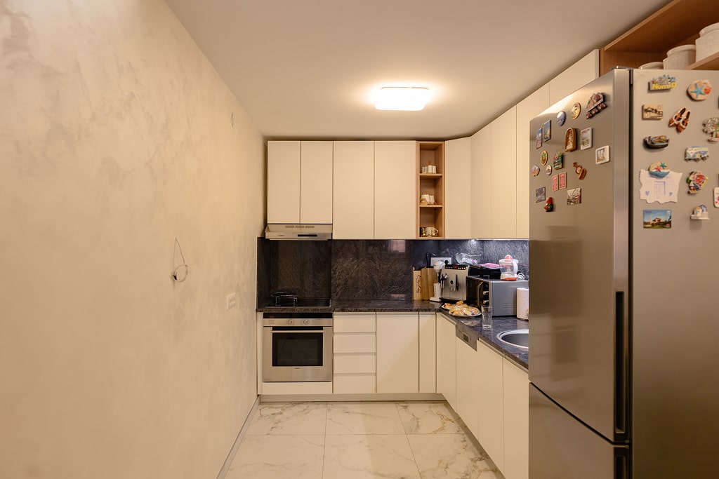 Pažljivo odabrana rasveta naglašava teksture zidova i ističe estetske vrednosti prostora, dok prozračnost i obilje prirodnog svetla unose dodatnu svežinu. Spoj modernih linija, toplih nijansi i dekorativnih detalja čini ovaj enterijer idealnim za savremeni način života, gde funkcionalnost i estetika idu ruku pod ruku.